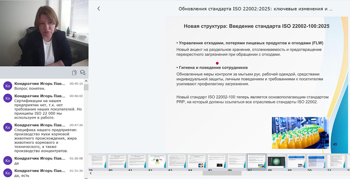 В течение двух дней были подробно рассмотрены изменения в серии стандартов ISO 22002, включая переход от технических спецификаций к полноценным международным стандартам, а также новая структура серии с выделением базового стандарта ISO 22002-100:2025 и отраслевых документов.