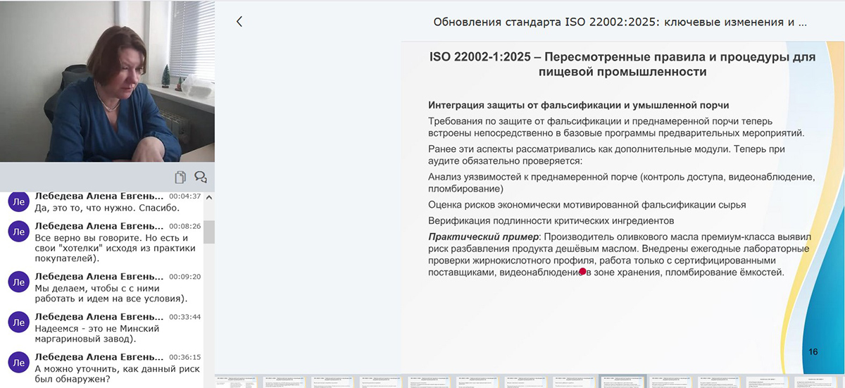 Использование онлайн-платформы Znaem.by позволило выстроить последовательную подачу материала и обеспечить постоянную обратную связь с участниками. Возможность фиксировать вопросы в чате и сразу получать пояснения делает обучение более структурированным и насыщенным, а также помогает лучше разобраться в требованиях стандарта и их применении в практической деятельности.