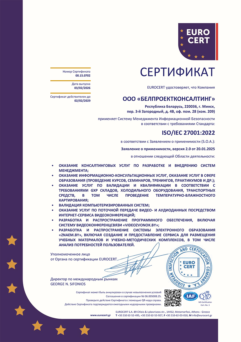 Система менеджмента информационной безопасности ООО «Белпроектконсалтинг» была впервые разработана, внедрена и сертифицирована на соответствие требованиям стандарта ISO/IEC 27001 в 2019 году в международном органе по сертификации. С момента первичной сертификации система расширилась в своей области определения и регулярно подтверждает свое соответствие требованиям стандарта в рамках надзорных аудитов и ресертификаций, обеспечивая устойчивость и непрерывность процессов управления информационной безопасностью.