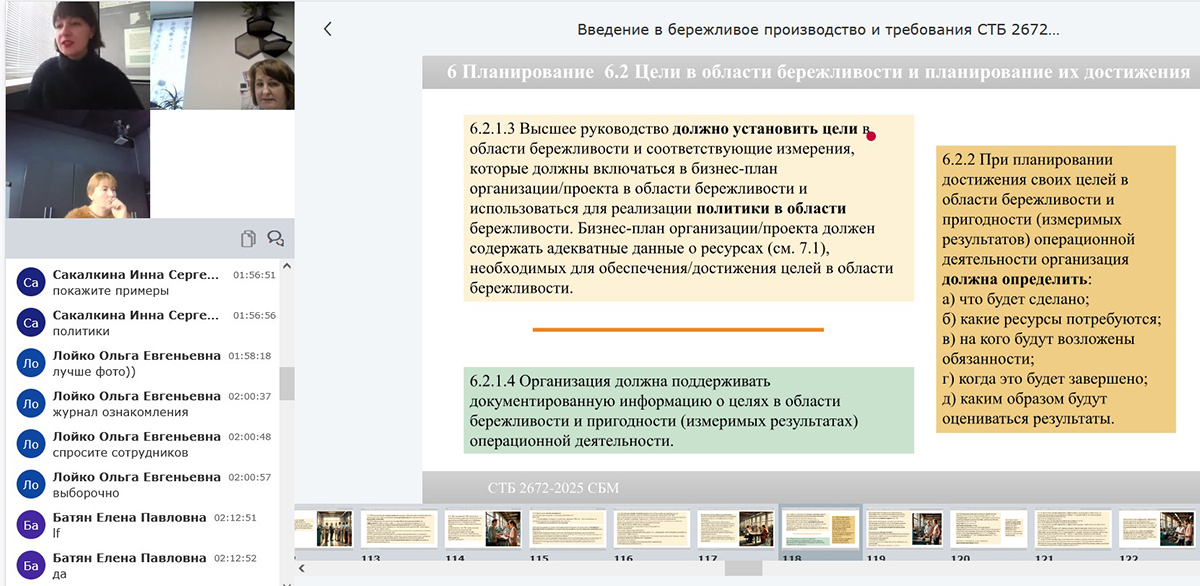 Прохождение семинара позволило специалистам системно разобраться в сути бережливого производства как управленческой концепции и понять логику её применения на практике. Участники получили представление о требованиях СТБ 2672-2025 и о том, как выстраивать работу по внедрению бережливого менеджмента в условиях конкретного предприятия, увязывая инициативы по улучшениям с действующей системой менеджмента качества. Полученные знания могут быть использованы при планировании и реализации проектов по совершенствованию процессов, повышению управляемости изменений и формированию единого подхода к развитию организации.