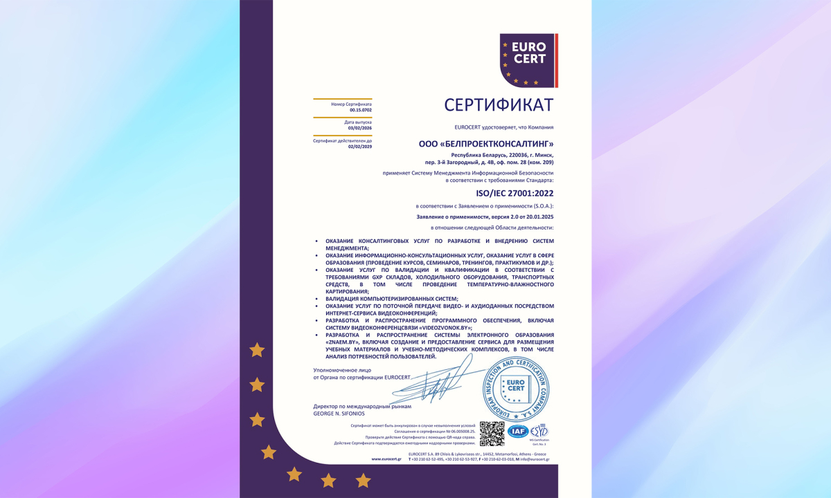 "БелПроектКонсалтинг" - это команда профессионалов, которая за 16 лет своей работы стала ведущей компанией - провайдером качества, безопасности и подтверждения соответствия на основе международных и национальных стандартов. Читать далее