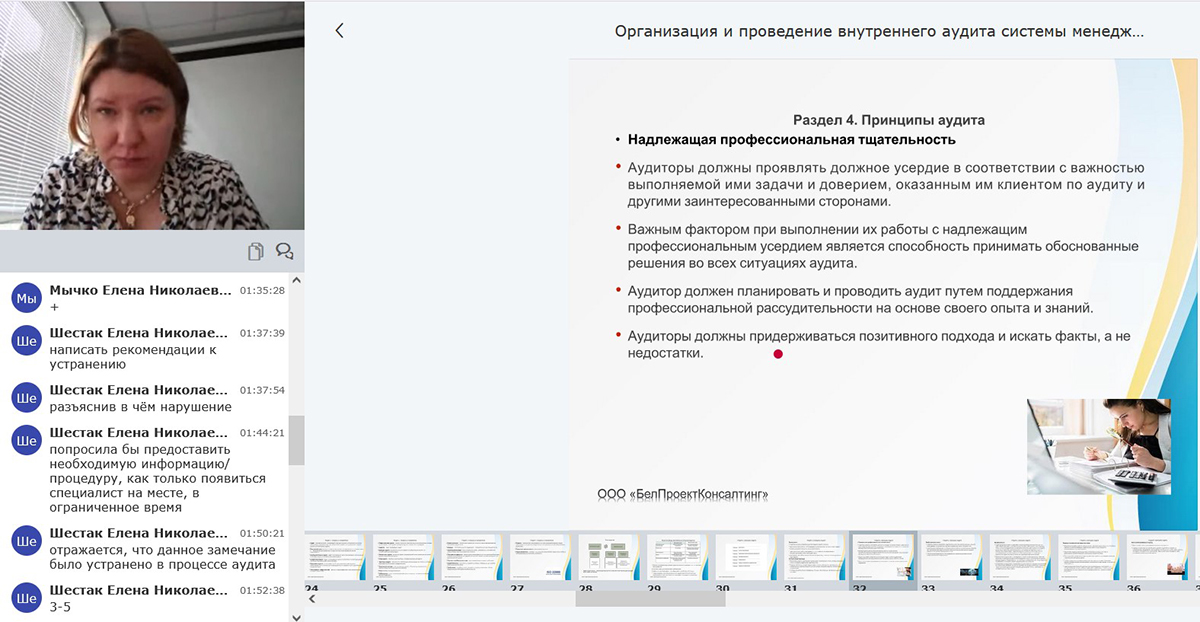 Общение в рамках семинара было реализовано через чат системы видеоконференции, что обеспечило живой и конструктивный диалог. Участники активно включались в обсуждение, делились практическим опытом, приводили примеры из деятельности своих предприятий. Преподаватель задавала наводящие вопросы, побуждала слушателей к анализу реальных производственных ситуаций и обсуждению возможных решений, а также иллюстрировала положения стандартов примерами из собственной профессиональной практики. Такая форма взаимодействия способствовала более глубокому пониманию требований и их прикладного значения.
