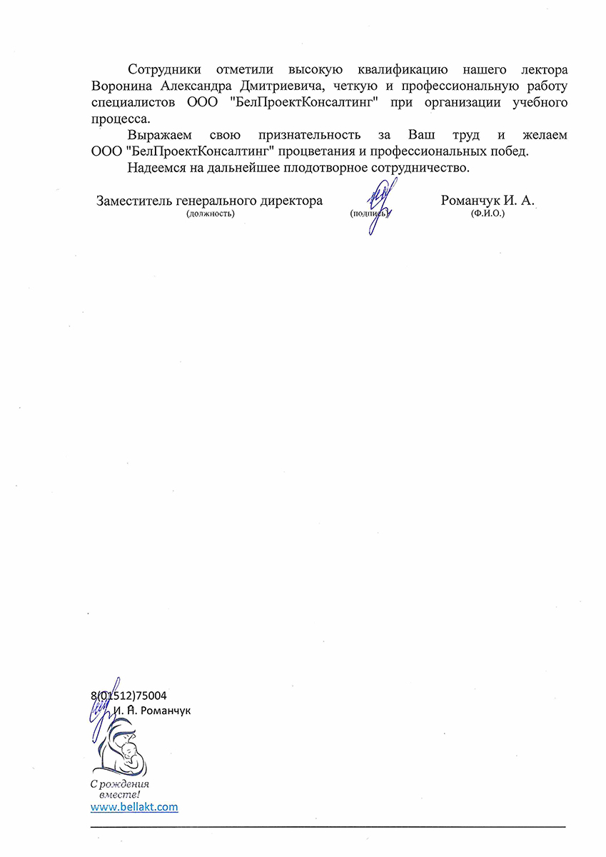 Сотрудники отметили высокую квалификацию нашего лектора Воронина Александра Дмитриевича, четкую и профессиональную работу специалистов ООО "БелПроектКонсалтинг" при организации учебного процесса.